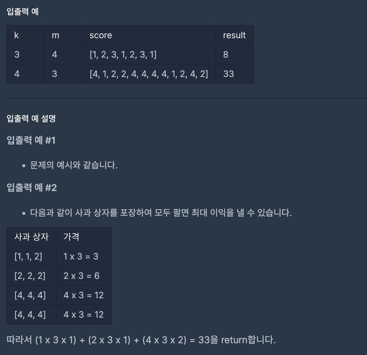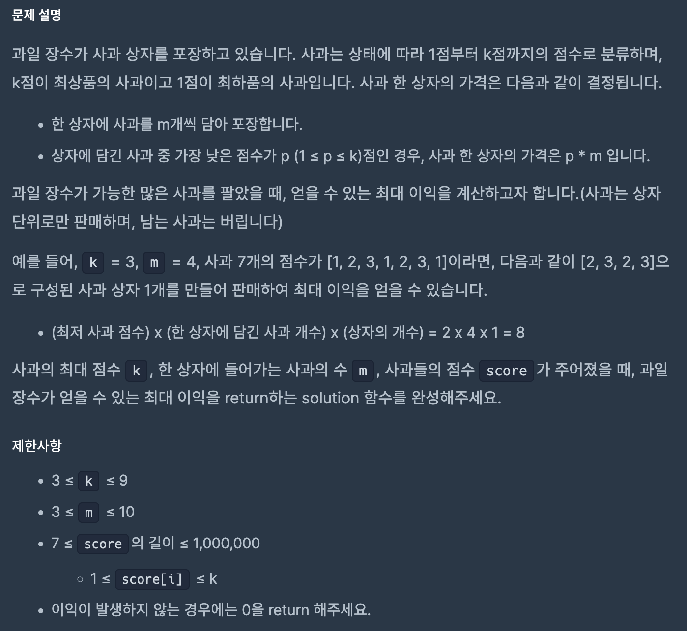 //사과박스에 들어있는 사과의 점수중 가장 낮은숫자와 m을 곱해서 사과박스의 점수를 매기고 모두 합산하여 값을 리턴함