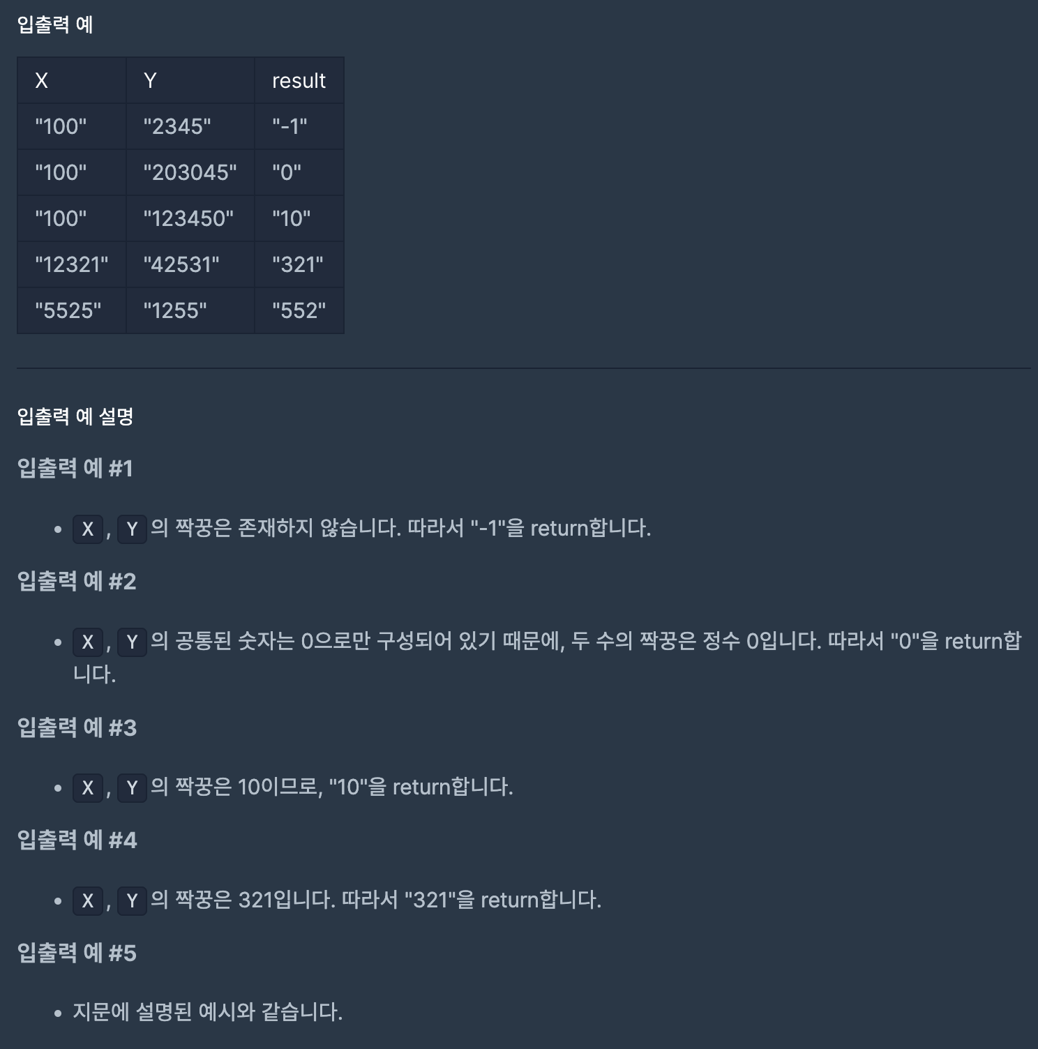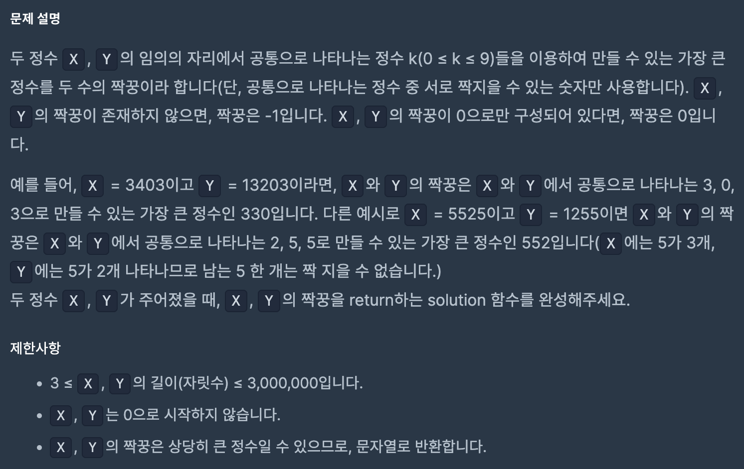 문제만 보면 두 배열의 수에서 중복된 수를 구해 정렬하면 되는 간단한 문제처럼 보였지만 반복문을 사용해서 중복된 수를 구하려니 계속 오류가 나고 제대로 구하기도 힘들었다. map을 이용해 숫자가 나오는 빈도를 카운트했고 그 숫자를 key값으로 , x와 y에 같은 수가 있다면 . 그수의 빈도에서 둘중 더 낮은값 ( 공통으로 나왔을 떄에 중복되는 수) 만큼 배열에 추가를 해주어 정렬하고 문자열로 변환 하니 값을 찾을 수있었고 제한사항에 있는 배열에 값이 하나도없다면 -1 리턴 , 그리고 0이 두번나오면 00이되는 경우가 생기기에 만약 0이 중복으로 나오게 되었을때에 배열을 reduce를 이용해 모든 값을 더했을때에 0이라면 0을 리턴하도록 했다.