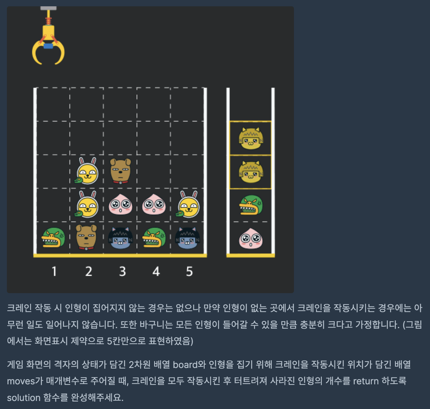 //인형을 담을 바구니를 생성하고 moves 에 해당하는 인덱스(+1)를 바구니에 담아준다. 인형을 뽑으면 해당하는 인덱스는 0으로 바꿔준다 만약 뽑으려는 인덱스가 0일 시에는 인형이 안담겨있다는 뜻이므로(2차원 배열의 마지막 인덱스의 배열에서 0일경우) 아무일도 일어나지 않음