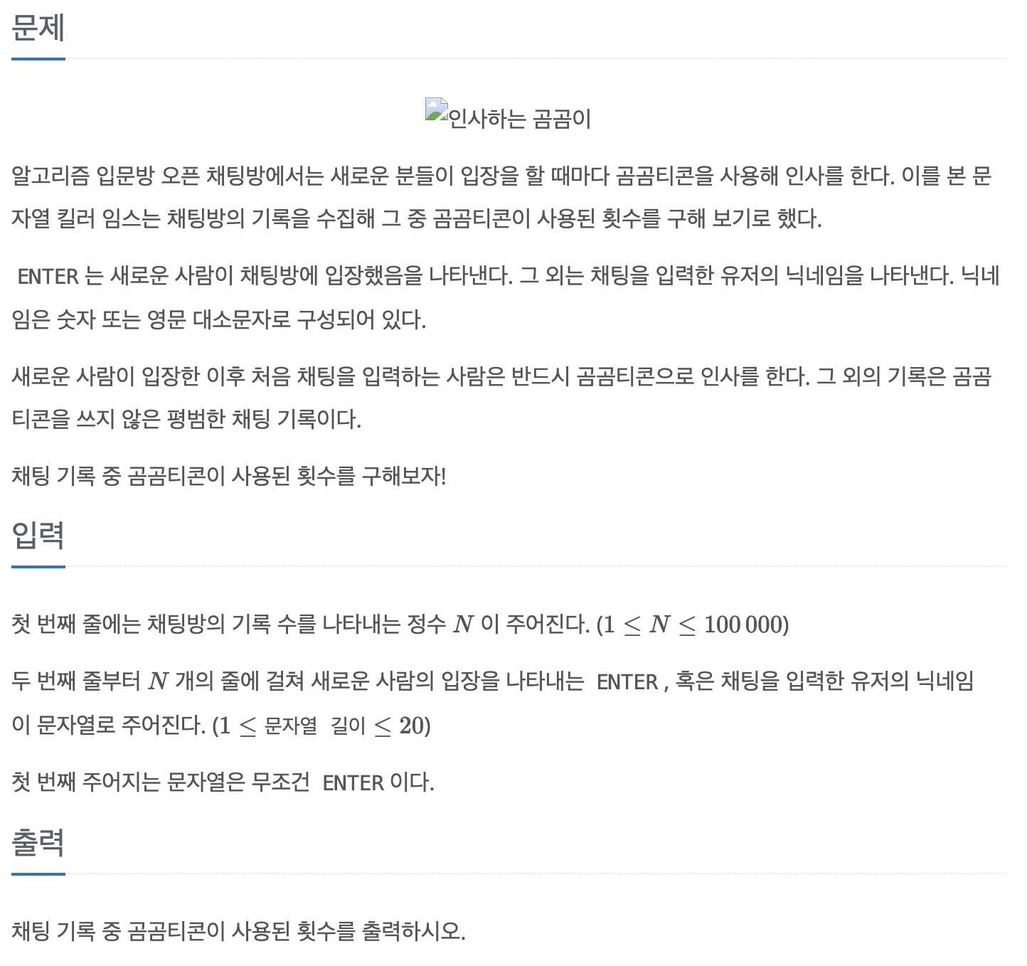 처음에는 이렇게 풀었었다. ENTER를 기준으로 문자열을 나누어 배열로만들고 그 배열에서 set을 이용해 중복을 없애고 수를 카운트하여 계산했다. 결과는 실패... 무엇이 문제인가 찾다가 예시로 ENTER 를 연속으로 추가하니 빈문자열이 set객체에 들어가 그 수를 카운트 하고있었다...